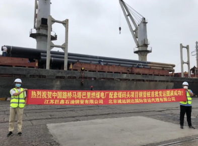 2020年6月2日,在江苏巨鑫石油钢管有限公司海工基地码头,巨鑫钢管为中国路桥公司孟加拉蒙塔巴瑞电厂码头项目制造的首批118支钢管桩顺利发运。