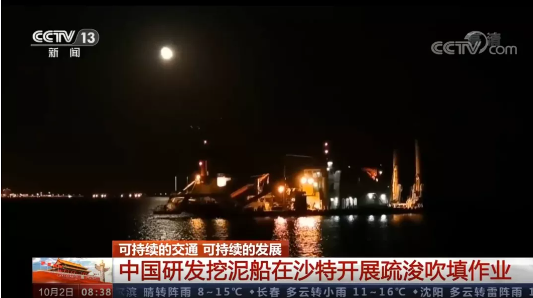 10月2日,央视《朝闻天下》栏目报道国庆期间中交集团加紧建设海外项目,推动“一带一路”交通基础设施互联互通。中交广航局绞吸挖泥船“力龙”在沙特阿美贝里钻井岛项目开展疏浚吹填作业的实时画面在节目中亮相。