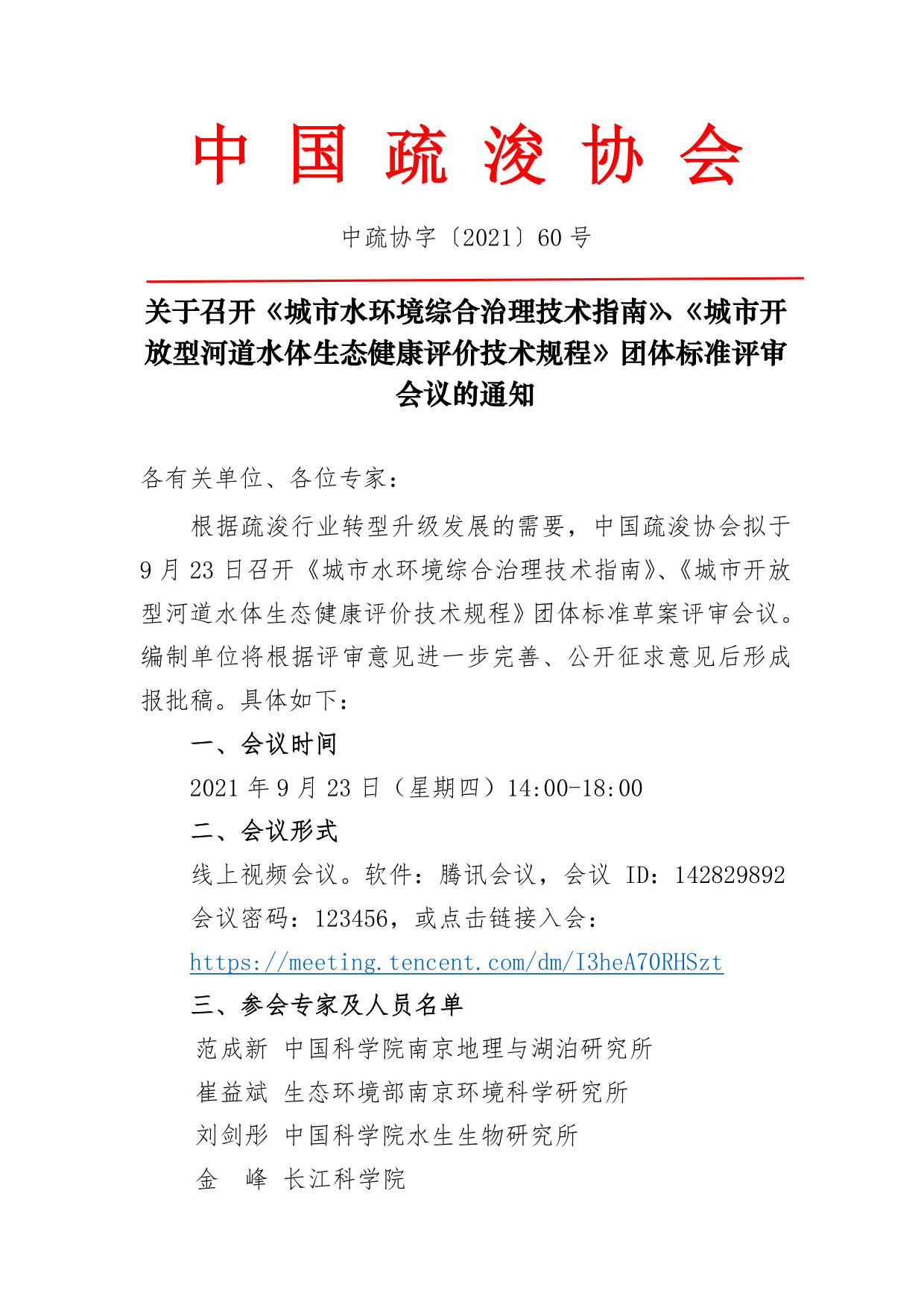 关于召开《城市水环境综合治理技术指南》、《城市开放型河道水体生态健康评价技术规程》团体标准评审会议的通知