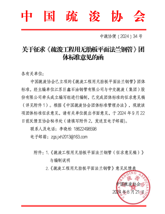 关于征求《疏浚工程用无肋板平面法兰钢管》团体标准意见的函