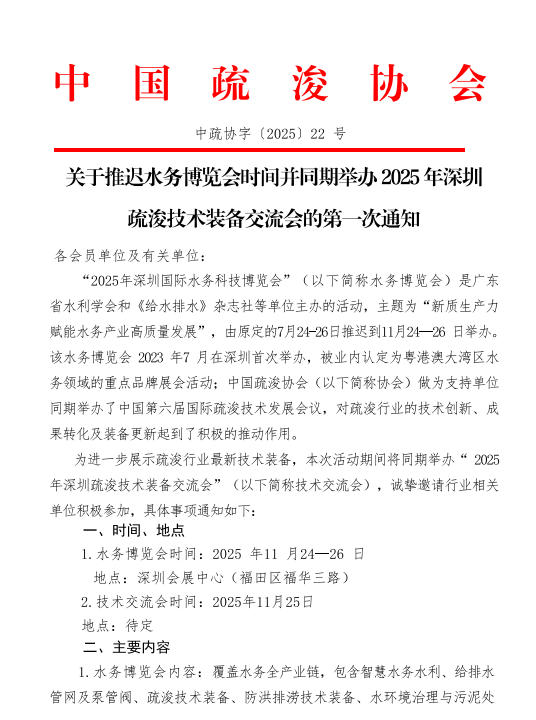 关于推迟水务博览会时间并同期举办 2025 年深圳疏浚技术装备交流会的第一次通知