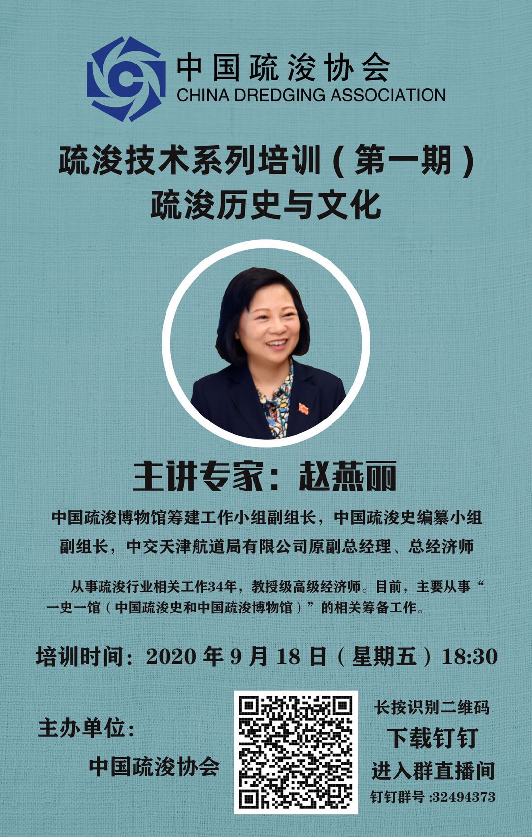 为进一步推动疏浚行业稳定健康可持续发展,普及疏浚基础知识,提升疏浚从业者专业水平,中国疏浚协会计划举办疏浚知识系列培训,第一期第二讲为疏浚历史与文化,由中国疏浚博物馆筹建工作小组副组长、中国疏浚史编纂小组副组长赵燕丽担任主讲专家,敬请大家准时参加。