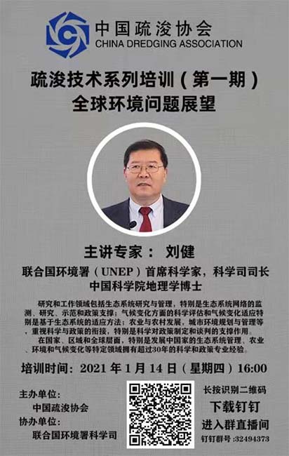为进一步推动疏浚行业稳定健康可持续发展,普及疏?;≈叮嵘杩4右嫡咦ㄒ邓?,中国疏浚协会举办了疏浚技术系列培训,第一期第十一讲为全球环境问题展望,于1月14日16:00由联合国环境署(UNEP)首席科学家刘健担任主讲专家,敬请大家准时参加。
